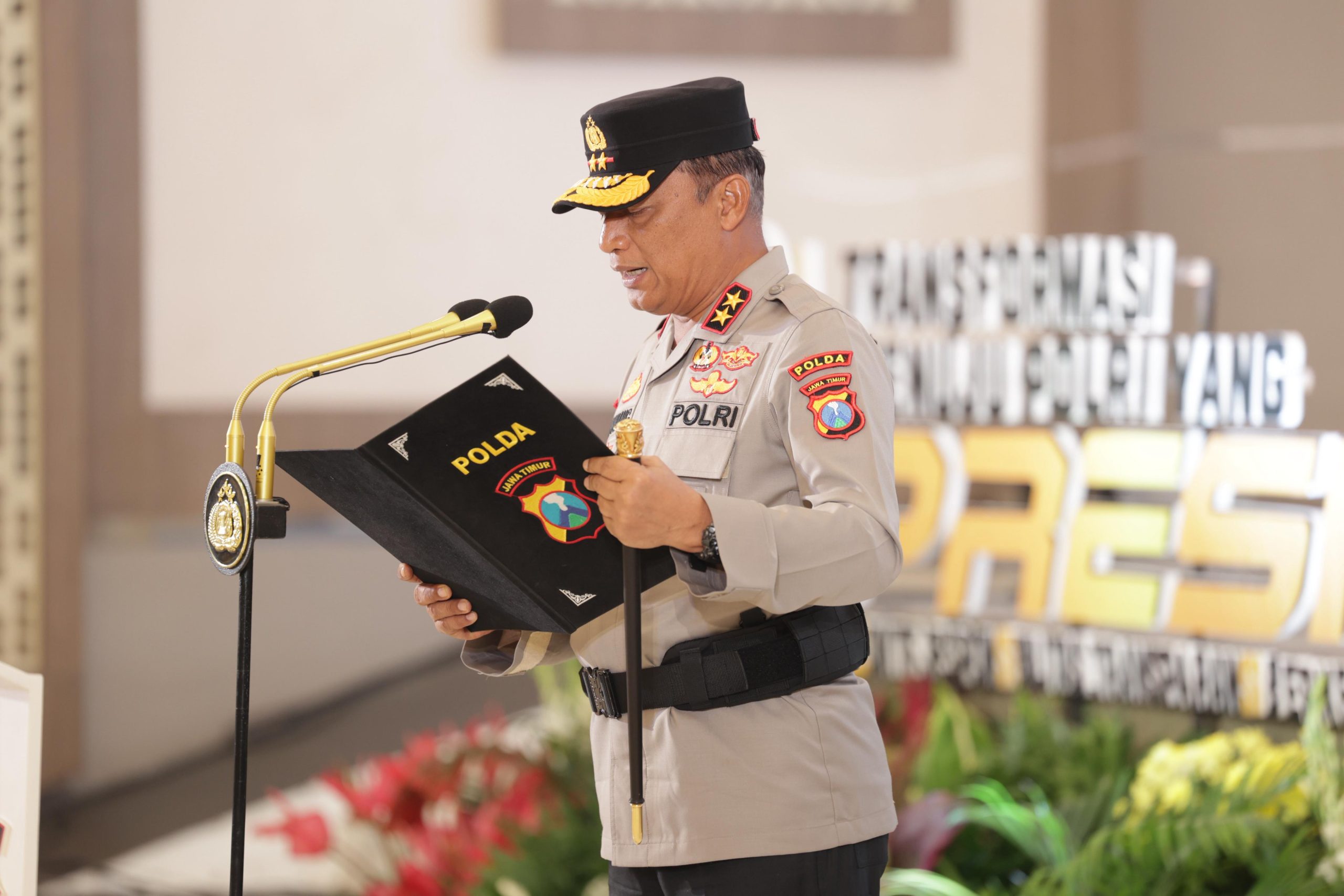 Kegiatan ini juga dihadiri Wakapolda Jatim, Irwasda, Pejabat Utama, para Kapolres, pengurus Bhayangkari, serta tamu undangan.